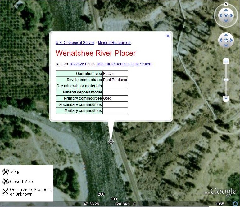 And finally, for comparison, here is the Wenatchee River Placer as seen in Google Earth.